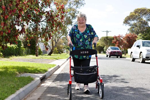 Lorraine Wilcox is a familiar sight as she clocks up the kilometres walking down the roads and pavements of Euroa with her trusty red walker.