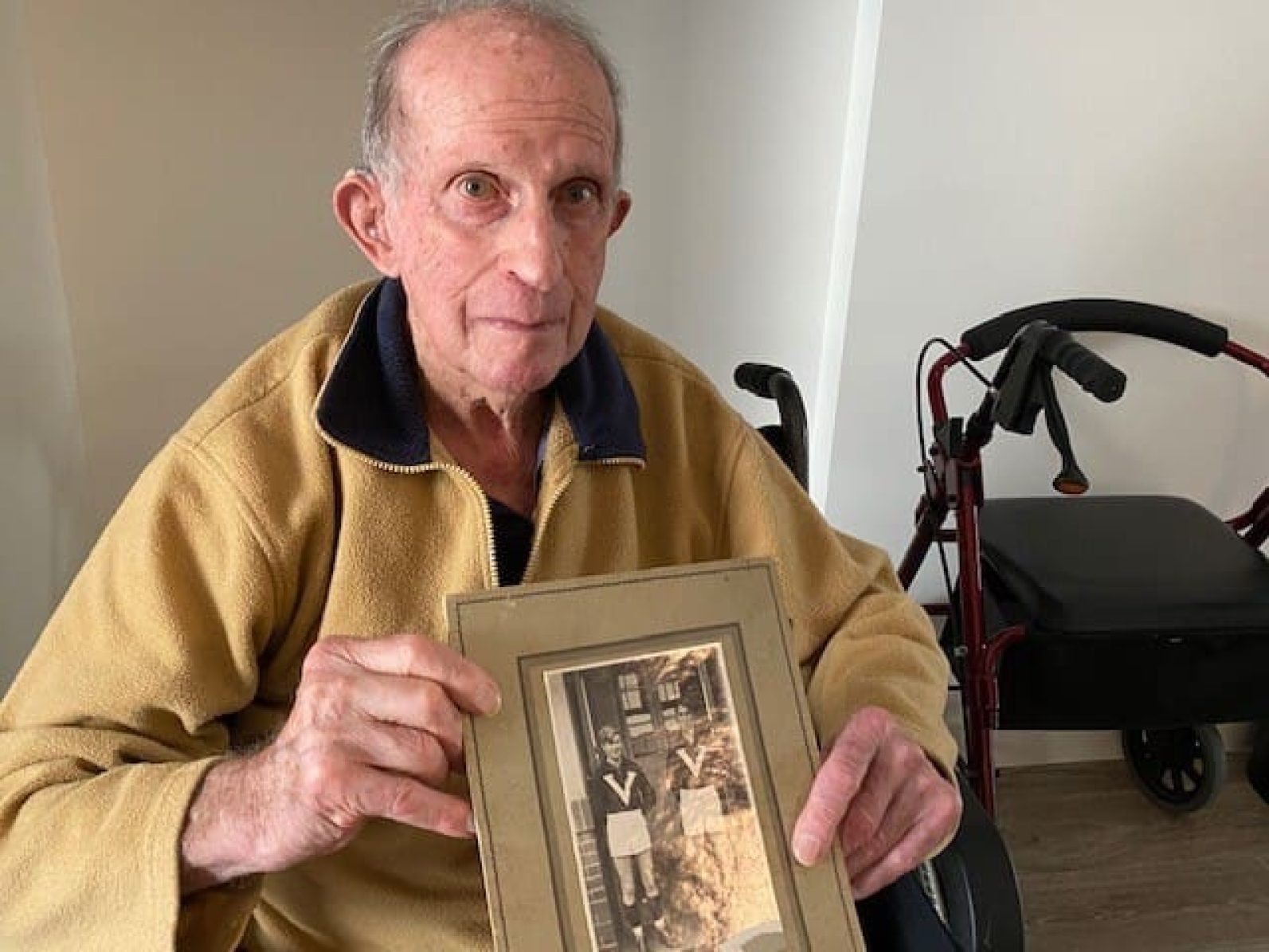 Ed, who moved into Uniting AgeWell Preston Community a year ago, was happy to be photographed in front of a poster of his beloved Bombers on the wall of his spacious bedroom – and holding a photo of himself as a young footy player.