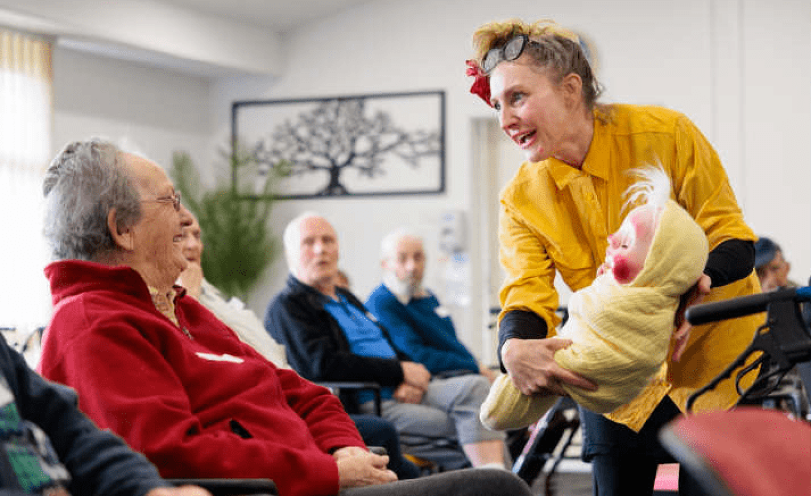 To everyone’s delight, the show started the minute the puppet troupe entered through the doors. The performance included not only the show, but the interaction with residents in the hallways and lounges as well as bedside visits to those unable to attend the show.