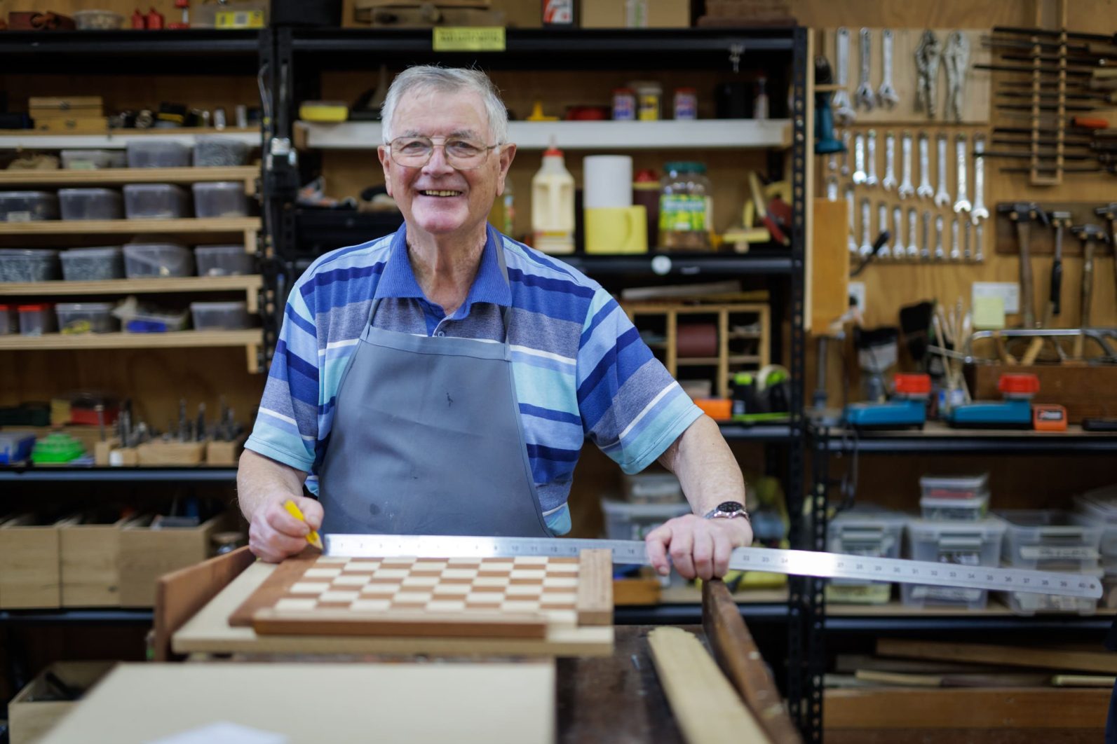 Peter Dobson, 79, retired four years ago and was utterly delighted to try his hand at woodwork – something he’s simply never had time to do. He’s made pizza paddles, chess boards, Chinese checker boards, a lazy Susan – wonderful heart-felt Christmas and birthday gifts for the whole family.