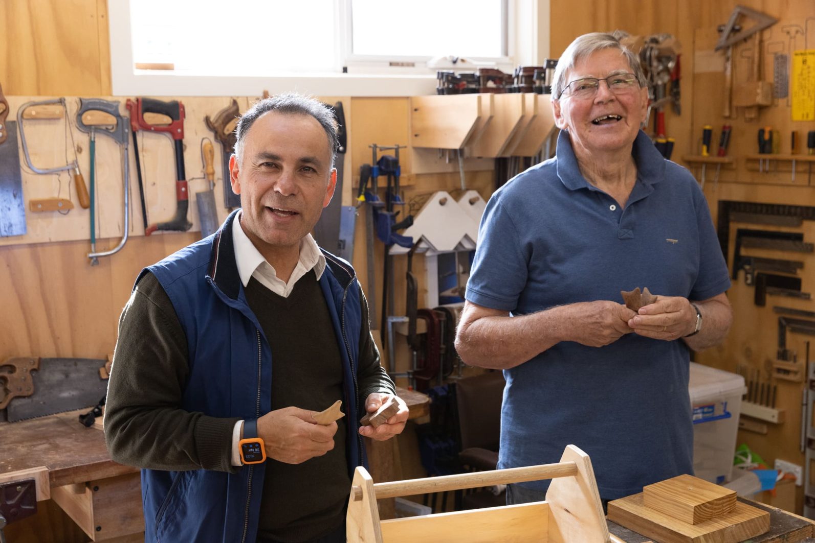 John was regaled with many stories including how a Men’s Shed participant created a swan version of a rocking horse for his beautiful Swan Princess granddaughter; how another built a high-chair for a dog with swallowing problems which needed to be fed sitting upright; and how they’re busy making tactile wooden hearts and crosses for end-of-life patients at a hospital.