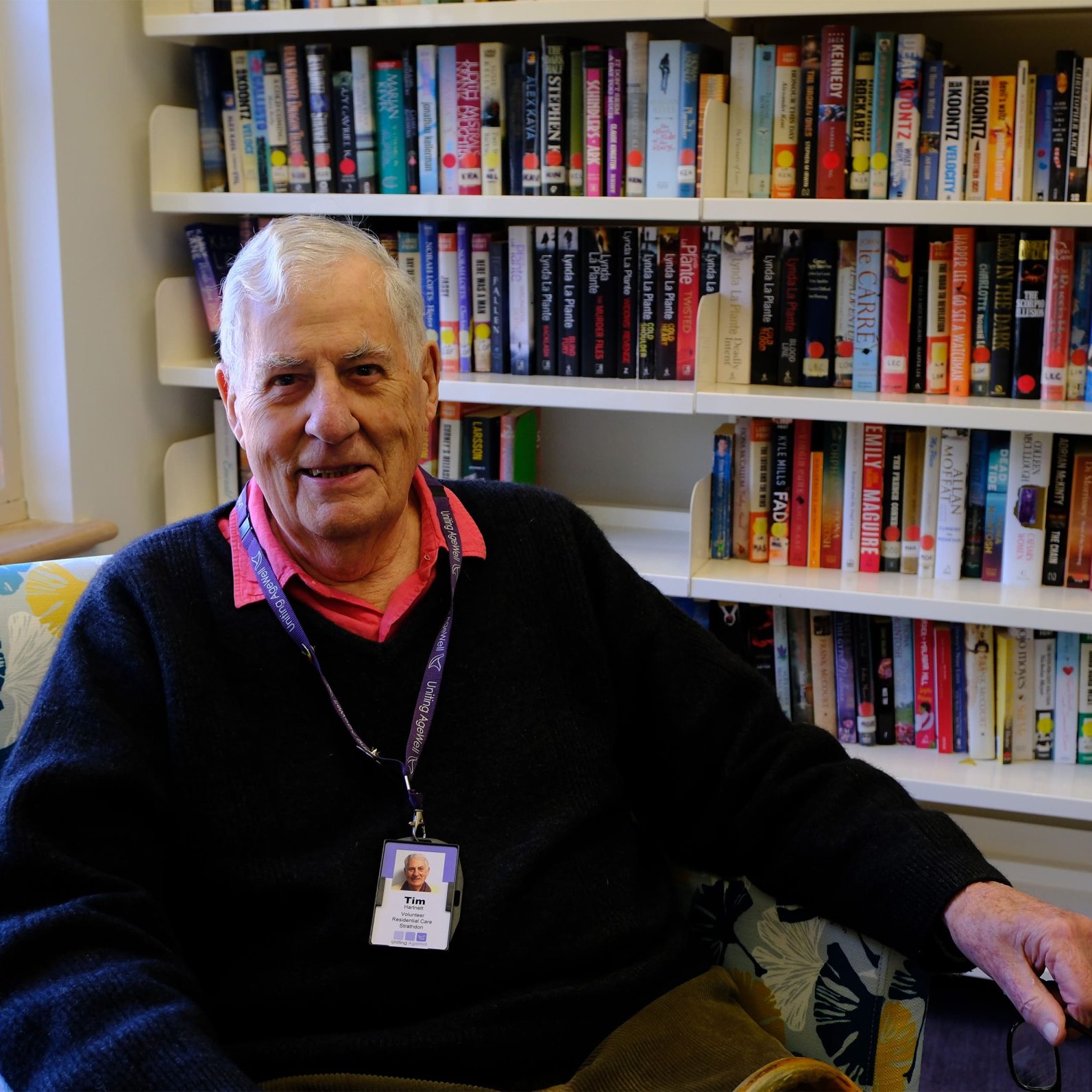 The library is his domain – and he loves it. Tim volunteers in the library for an hour in the morning and an hour in the afternoon, opening and closing the room, packing away books and sorting through new ones.
