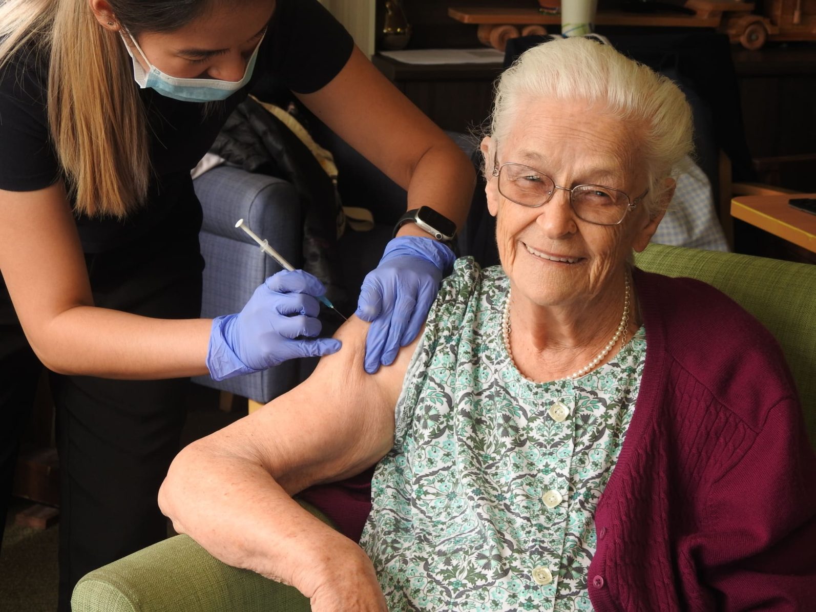 Hazel Simpkins, who turns 90 in a few days, jumped at the opportunity to be next in the queue, noting, “It’s the best form of protection there is.” The great-grandmother, who has been at Strathaven for nearly three years, says the shot didn’t hurt a bit. “I felt nothing!” she says.