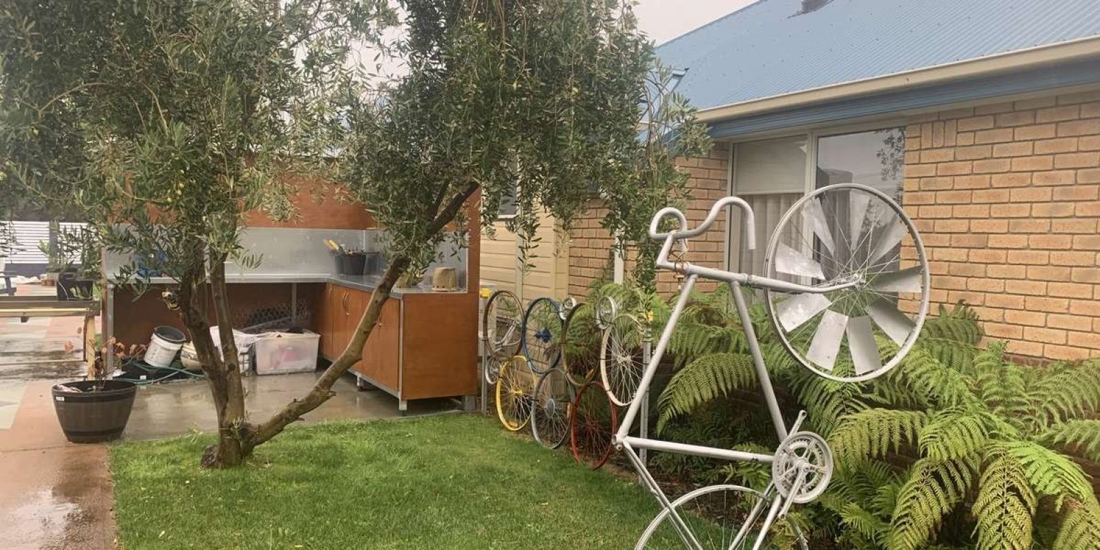 There are nine courtyards on the site, each of them unique. One is a veggie garden with fruit trees, another is home to the chickens. One of the courtyards has lavender and scented plants where residents and staff love sitting, another is ablaze with colourful dahlia and rhododendrons. Then there’s a community BBQ area, and another contemplative area with sculptures and plaques where families can even hold memorial services.