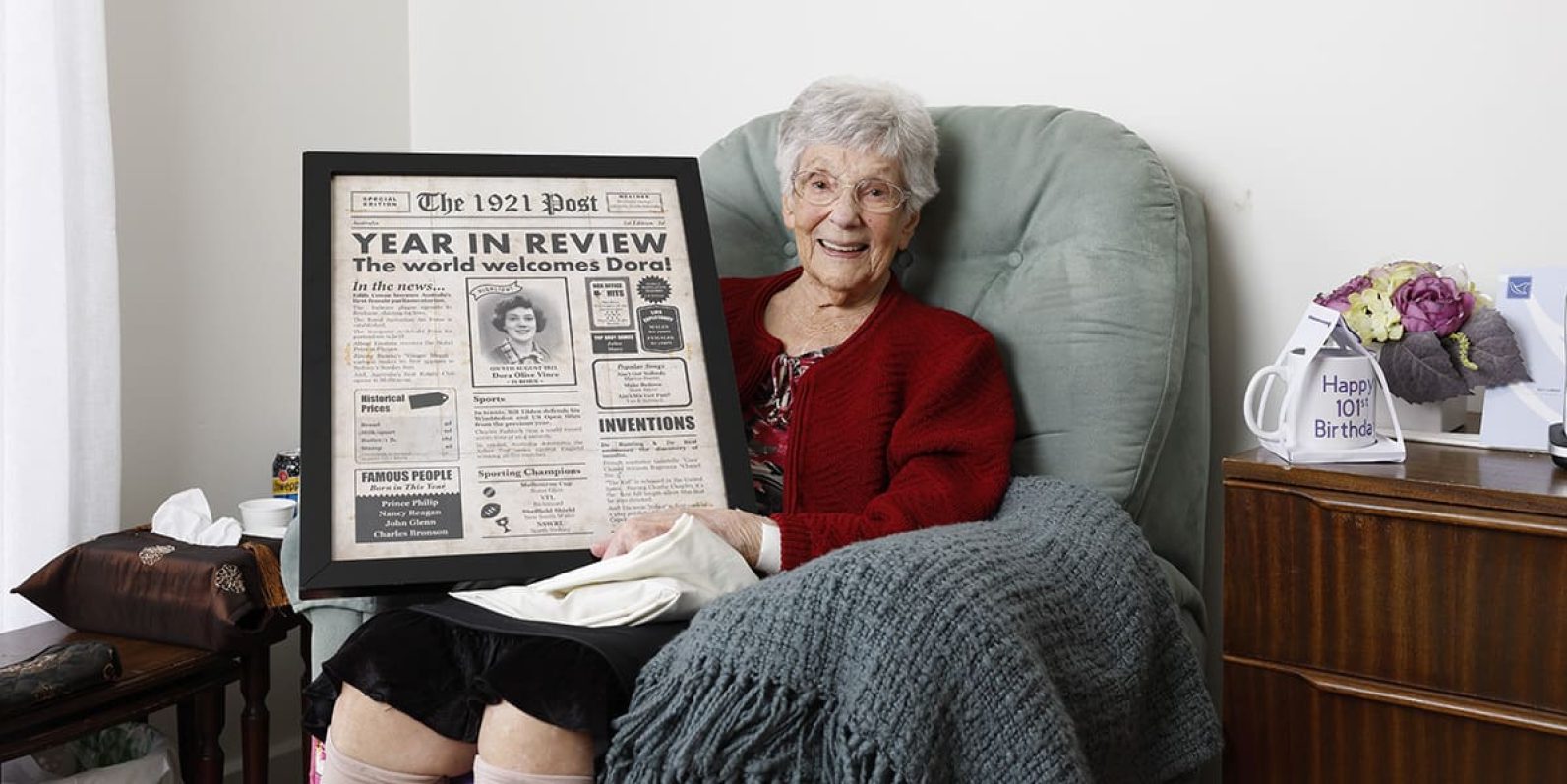 Caption: Dora pictured with a gift she received from one of her daughters-in law. It has a photo of her when she was aged 18 in the middle, with big events in the news from the year of her birth.